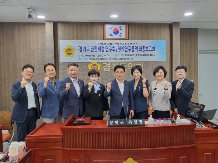 경기도의회 의원연구단체 ‘경기도 건전재정 연구회’(회장 문병근 의원)는 27일(화) 의회 여성가족평생교육위원회 회의실에서 경기도 재정건전성 제고를 위한 연구에 대한 정책연구용역 최종보고회를 개최했다.