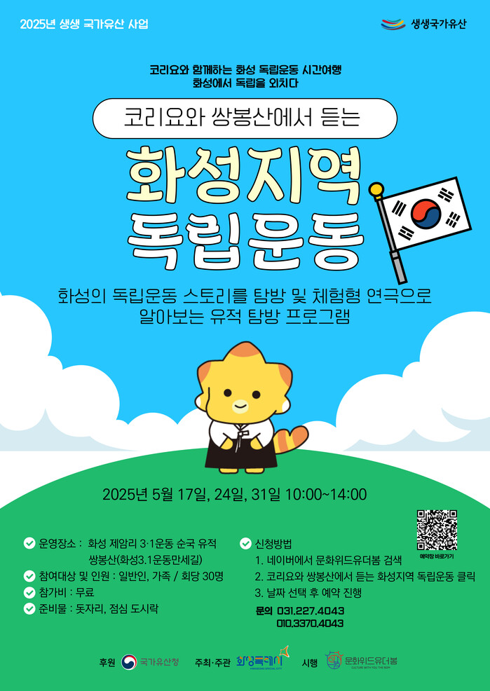 화성특례시(시장 정명근)가 오는 17일부터 ‘2025 우리고장 국가유산 활용사업(생생문화재)’의 두 번째 프로그램인 ‘코리요와 쌍봉산에서 듣는 화성지역 독립운동’을 운영한다.
