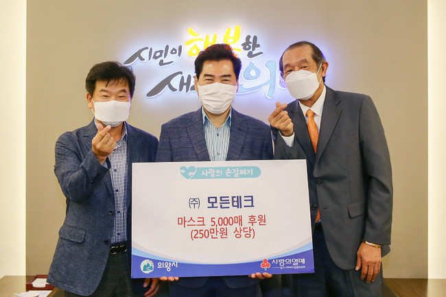 [로컬라이프] 의왕시(시장 김상돈)는 27일, 고천동에 소재한 ㈜모든테크(회장 박철순)에서 코로나19로 어려움을 겪고 있는 취약계층에게 전해 달라며 비말차단용 마스크 5000매를 기탁했다고 밝혔다.