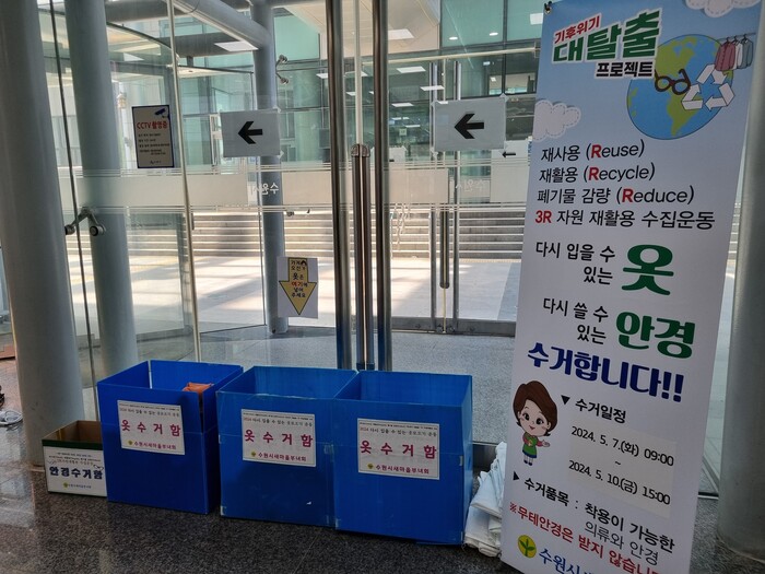 사진/시청 별관 로비에 설치한 ‘헌옷, 헌안경 모으기’ 수거함.(사진제공=수원시)