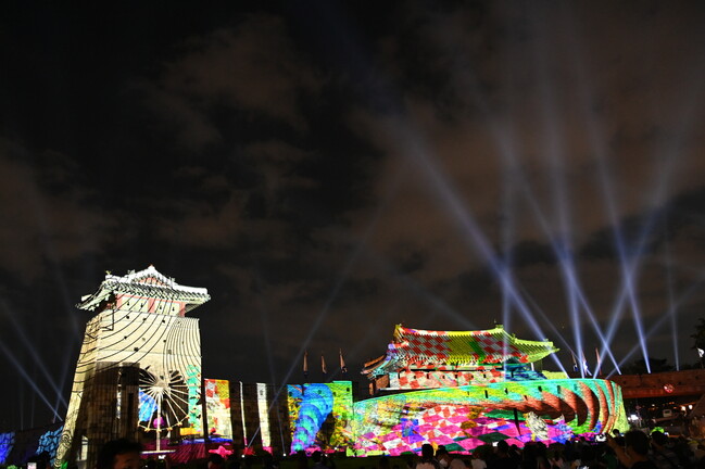 사진/수원화성 화서문과 서북공심돈 성벽을 배경으로 진행됐던 미디어아트쇼 ‘미디어파사드&라이트쇼’의 공연 장면.(사진제공=수원시)
