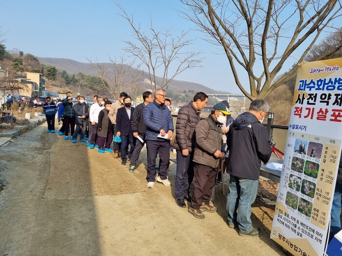이번 교육은 과수화상병 예방을 위한 행정명령 준수사항과 약제 살포 방법 등의 내용을 중점으로 진행했으며 꽃 피기 전(1차)과 개화기(2‧3차)에 방제할 약제 3종을 무상으로 배부했다.