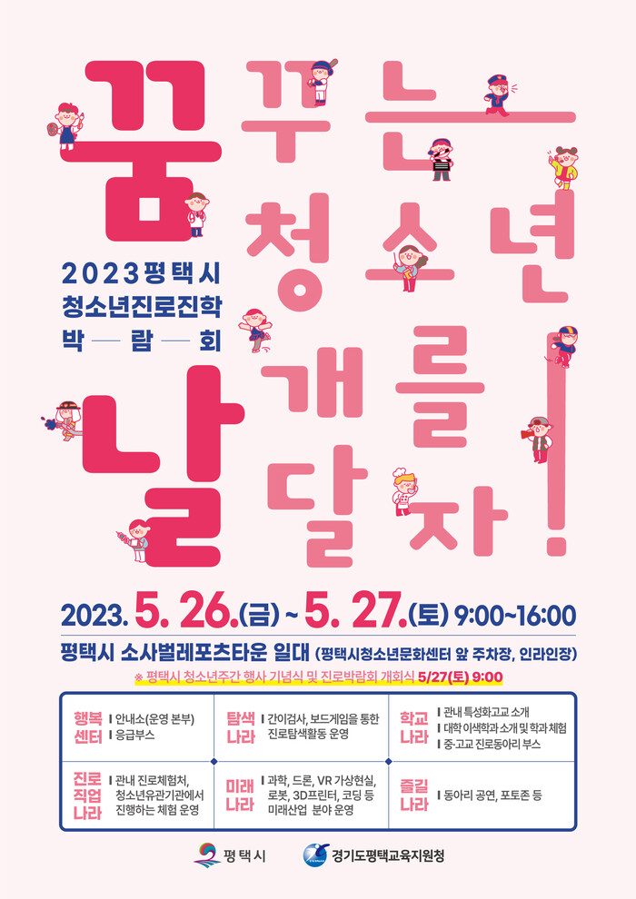 이번 2023 평택시 청소년진로진학박람회 ‘꿈날’은 코로나로 인하여 3년 만에 대면으로 개최하게 됐으며, 올해 처음으로 맞이하는 ‘제1회 평택시 청소년의 날’ 기념식과 함께 진행함에 따라 더욱더 의미 있는 행사가 될 예정이다.
