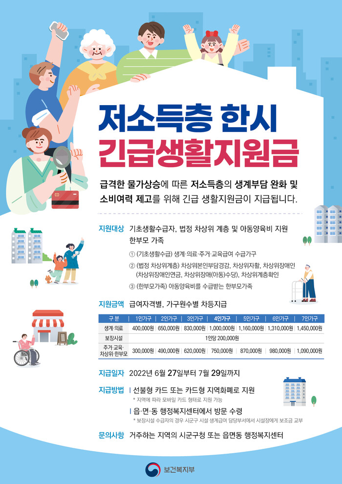 수원시가 급격한 물가상승으로 경제적 어려움을 겪는 저소득층 가구를 대상으로 6월 27일부터 7월 29일까지 ‘저소득층 한시 긴급생활지원금’을 지급한다.