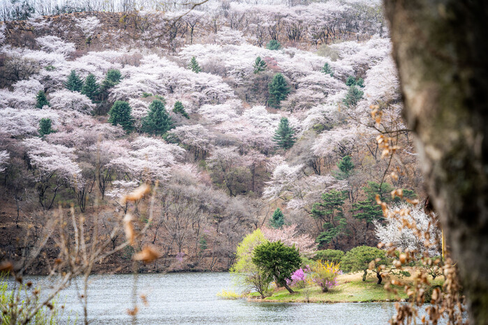 벚꽃이 차창 밖으로 나를 끌어내린다면 에버랜드길을 살짝 벗어나 호암미술관으로 향하는 것도 좋다. 흩날리는 벚꽃에 감싸여도 보고, 내려앉은 벚꽃을 조심조심 밟아도 보자. 가실벚꽃길 끝에서 만나는 삼만육천지 건너편 산자락에도 벚꽃이 가득하다.