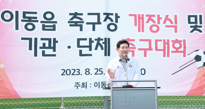 이동읍 축구장은 인조잔디 축구장 1면(90mX50m)으로 지난 6월 준공됐다. 축구장의 잔디는 강원도 춘천에 위치한 ‘손흥민 축구장’과 같은 특수공법을 적용해 폭우 상황에서 물이 고이는 현상을 해소하고 경기 중 선수들의 부상을 최소화할 수 있도록 조성했다.