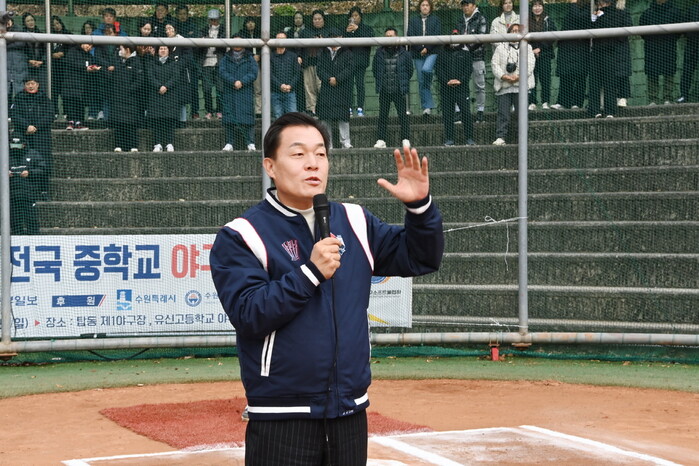 이재준 수원특례시장이 지난 19일 유신고등학교 야구경기장에서 열린 ‘수원시장기 U-14 전국 중학교 야구대회’ 결승전에서 시구를 하고 “이번 대회가 승패 상관없이 여러분이 한층 더 성장할 수 있는 대회가 됐길 바란다”고 말했다.