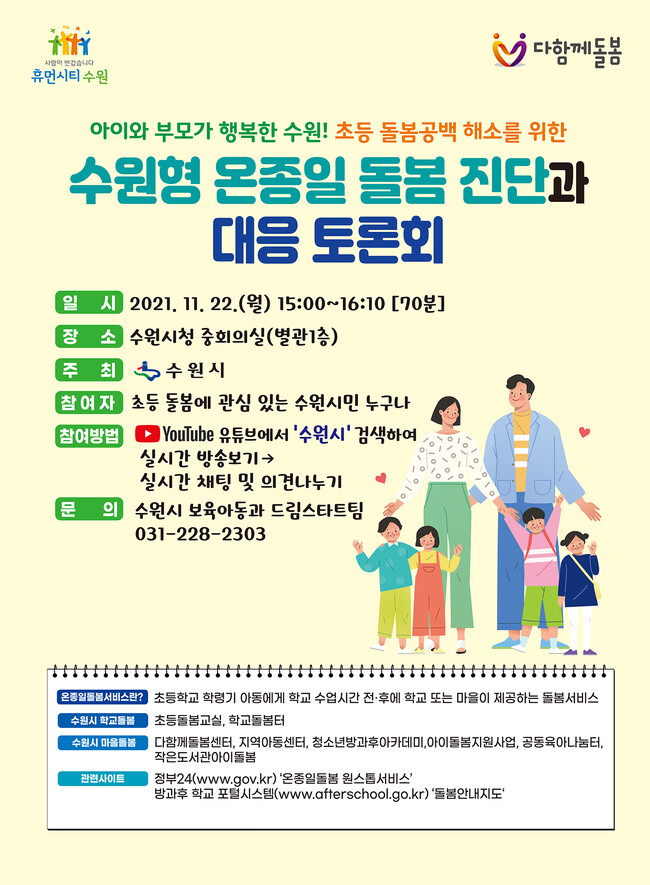 수원시는 22일 오후 3시 수원시청 중회의실에서 대면·비대면 병행 방식으로 ‘수원형 온종일 돌봄 진단과 대응 토론회’를 개최한다.