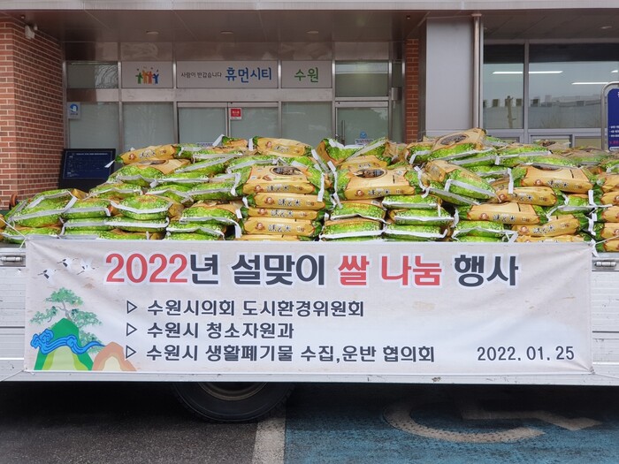 수원시 생활폐기물 수집·운반 대행업체 협의회가 설 명절을 맞아 “경제적으로 어려움을 겪는 이웃들에게 전달해 달라”며 수원시에 쌀 360포를 기부했다.