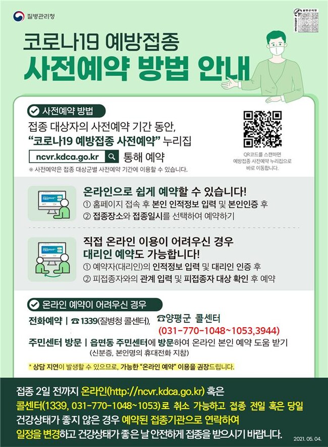 사전예약방법은 위탁의료기관 30개소(※사전예약누리집 혹은 양평군 홈페이지안내)에 전화 및 방문을 통한 예약이 가능하며, 누리집(https://ncvr.kdca.go.kr)을 통해 온라인으로 배우자 및 자녀 등 보호자에 의한 대리예약도 가능하다. 또한, 온라인이나 전화 예약이 어려운 경우 신분증과 본인명의 휴대전화를 지참해 읍·면사무소를 방문하면 도움을 받을 수 있다.