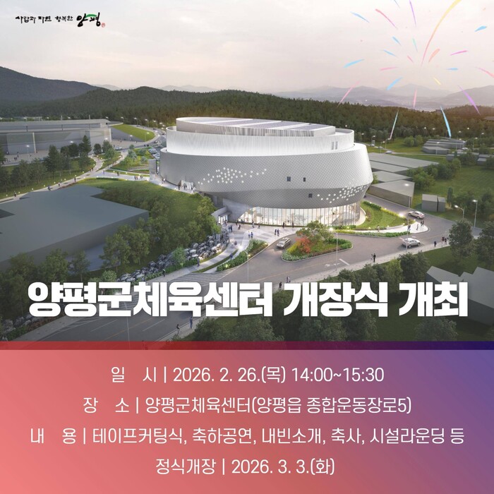 이어 오늘 준공되는 양평군체육센터가 군민 누구나 일상에서 체육을 즐기고 건강을 지킬 수 있는 주민 활력을 높이는 공간으로서 자리매김하기를 바란다고 강조했다.