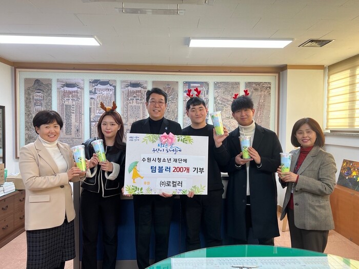 수원 로컬콘텐츠 제작 기업인 ㈜로컬러가 “수원시청소년재단에서 활동하는 청소년들에게 전달해 달라”며 자체 제작한 ‘수원이 텀블러’ 200개를 수원시청소년재단에 기부했다.