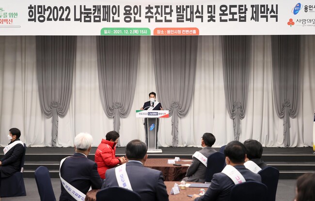 사진/ 백군기 용인시장이 2일 희망2022 나눔캠페인 용인 추진단 발대식 및 온도탑 제막식에서 인사말을 하고 있다.(사진제공=용인시)