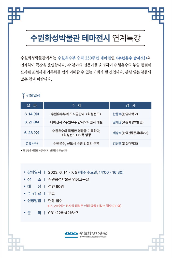 수원시 관계자는 “테마전 ‘수원유수 납시오’를 이해하고, 230년 전 수원의 역사적 위상을 살펴볼 수 있는 강의가 될 것”이라고 말했다.