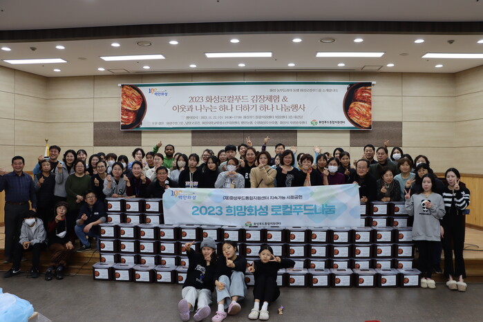 (재)화성푸드통합지원센터(이사장 이원철)가 22일 화성푸드통합지원센터 복합관 3층에서‘2023 화성로컬푸드 김장체험 이웃과 나누는 하나 더하기 하나’행사를 개최했다.