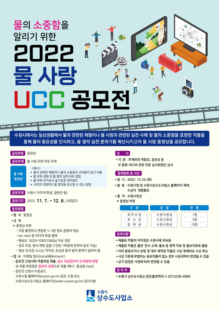 수원시는 12월 6일까지 수원시 거주자를 대상으로 ‘2022 물 사랑 UCC 공모전’을 개최한다.