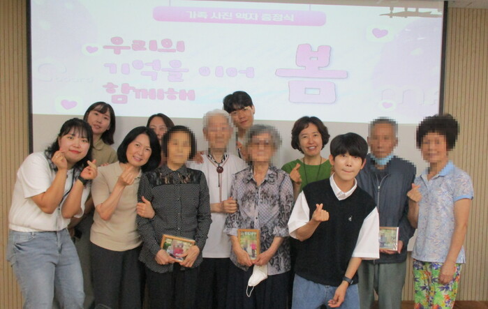 사진/앨범증정식 후 치매안심센터 직원, 가족들이 함께하고 있다.(사진제공=수원시)