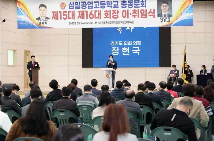 장현국 경기도의회 의장(더민주, 수원7)은 26일 오후 수원 삼일공고 체육관에서 개최된 ‘삼일공고 총동문회 제15대 및 제16대 회장 이‧취임식’에 참석했다.