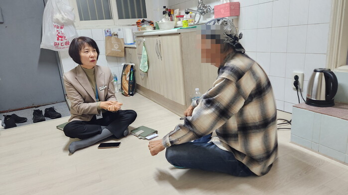 사진/허순옥 베테랑팀장이 조OO씨와 이야기를 나누고 있다.(사진제공=수원시)