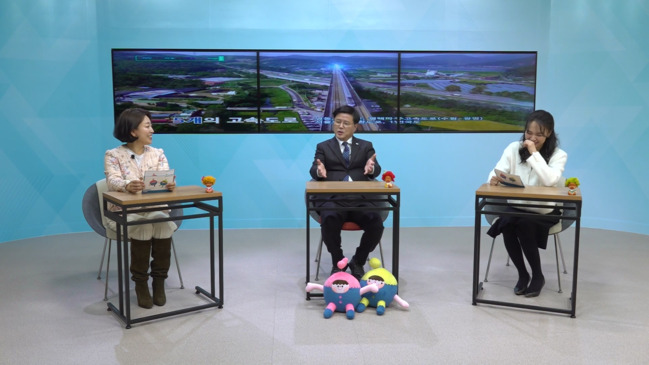 사진/군포시미디어센터에서 진행된 군포시 종무식·시무식 사전녹화에서 인터뷰하고 있는 한대희 시장(가운데) (사진=군포시청 제공)