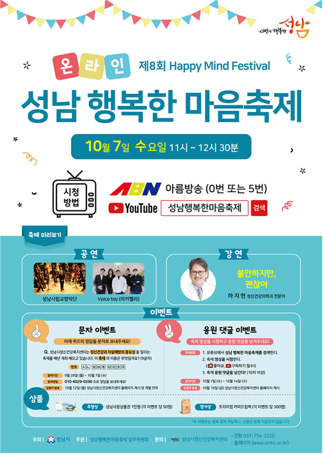 [로컬라이프] 성남시는 오는 10월 7일 오전 11시 온라인으로 ‘행복한 마음 축제’를 연다. 이날 축제는 1시간 30분 동안 성남시정신건강복지센터 유튜브 채널 등을 통해 방송한다.