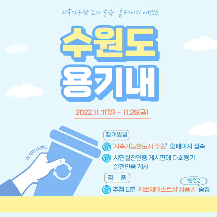 11월 7일부터 25일까지 수원시 홈페이지(https://www.suwon.go.kr)에서 ‘시민참여→지속가능한 도시 수원’이나 ‘시민참여 배너→지속가능한 도시 수원 이벤트 배너’로 접속해 ‘시민실천인증’ 게시판에 다회용기 사용 실천 인증 사진을 게시하면 된다.