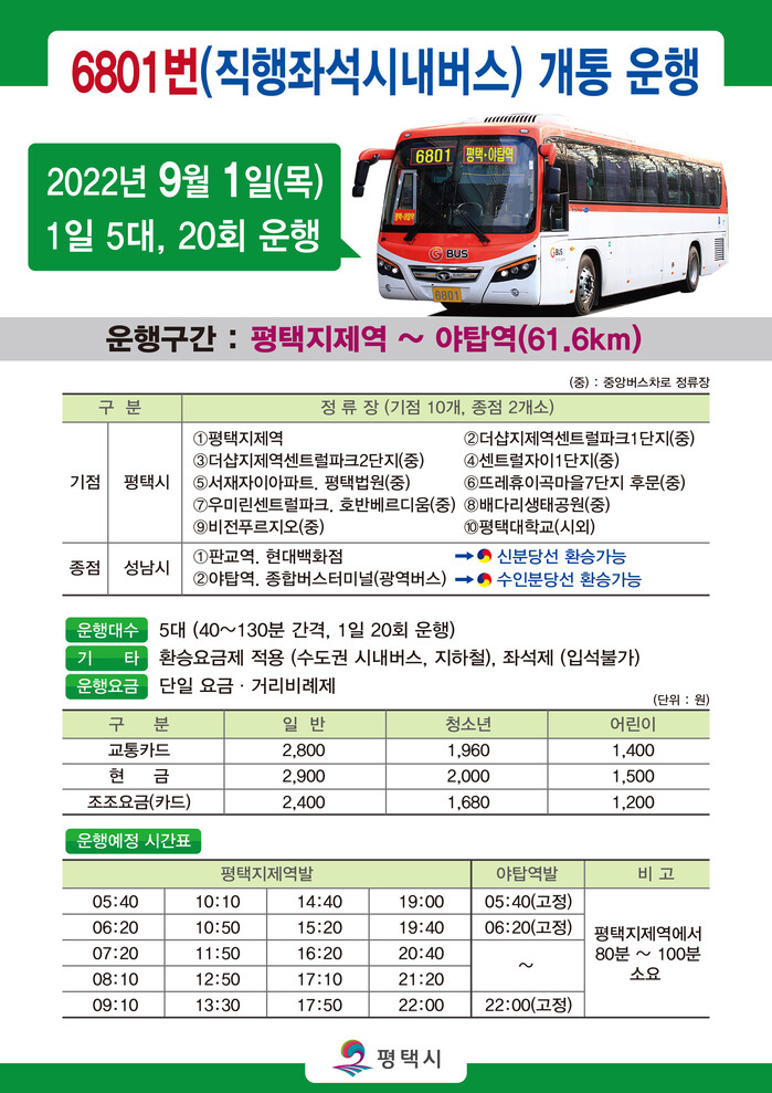 평택시(시장 정장선)는 평택~판교(평택지제역~야탑역)를 운행하는 광역버스(노선번호 6801번)를 오는 9월1일부터 신설 운행한다고 밝혔다.