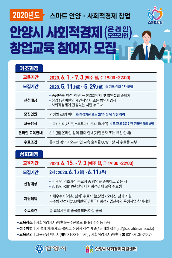 과정을 무사히 마친 교육생에 대해 수료증이 수여되며, 사회적경제지원센터 창업 인큐베이팅 입주 우대, 시 사회적기업 창업공모전과 육성사업 등의 멘토링 및 참가 지원 등의 특전이 주어진다. 기타 궁금한 사항은 안양시사회적경제지원센터(☎031-8045-2337)로 문의해 안내받을 수 있다.