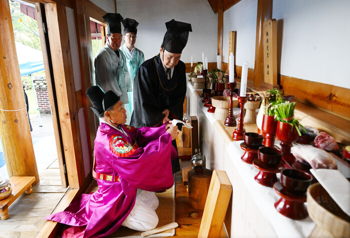 ▷초헌관은 면복하고 일어나 조금 물러나 북향으로 꿇어 앉으시오