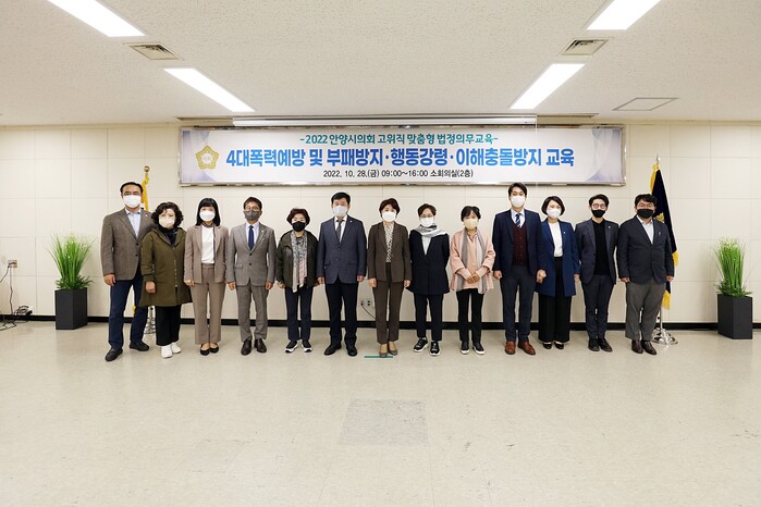 이번 교육은 제9대 안양시의회가 출범한 후, 첫 법정의무교육으로 공직자로서 가져야할 청렴의식 함양과 4대폭력(성희롱·성매매·성폭력·가정폭력)에 대한 예방 의식 고취를 위해 개최됐으며, 의원들의 적극적인 관심과 높은 참여율로 내실있게 진행됐다.