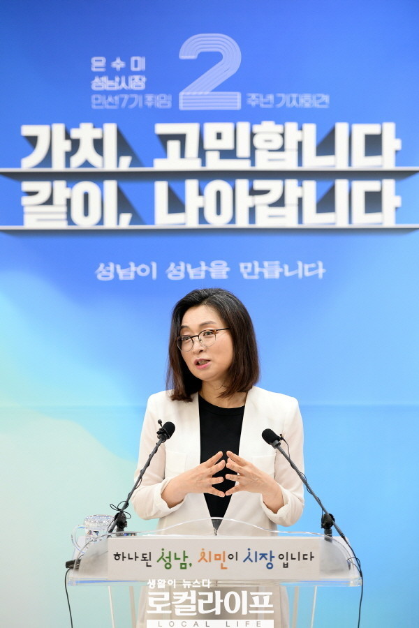 | ▲ 은수미 성남시장은 공공의료 강화의 필요성을 지적하며, 이를 위한 제도적 보완과 사회적 합의의 중요성을 강조했다. 사진은 은수미 시장의 취임 2주년 기자회견 모습. (사진제공=성남시) |