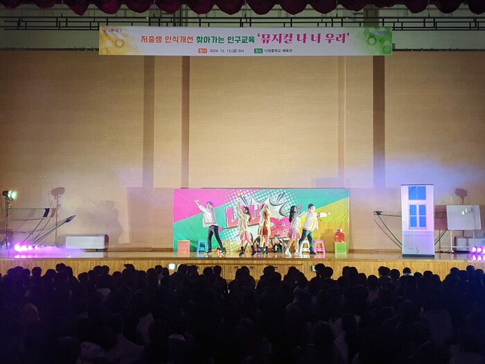 또, 지난 13일에는 다원중학교 강당에서 중학생 3학년 학생 420명을 대상으로 저출생 극복 인식개선 인구교육 뮤지컬인 ‘나 너 우리’ 공연을 운영했다.