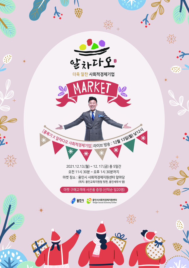 용인시는 13~17일 처인구 삼가동 사회적경제 허브센터 앞마당에서 관내 사회적경제기업 10곳에서 생산한 제품을 온·오프라인으로 판매하는 ‘알차다오’ 마켓을 개최한다고 밝혔다.