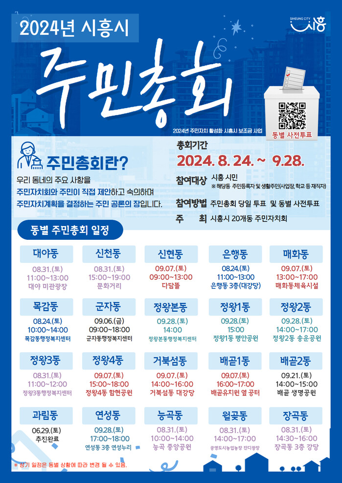 각 동 주민총회 일정은 ▲8월 24일 목감동, 은행동 ▲8월 31일 능곡동, 정왕3동, 대야동, 월곶동, 장곡동, 신천동 ▲9월 6일 군자동 ▲9월 7일 신현동, 매화동, 거북섬동, 정왕4동, 배곧1동 ▲9월 21일 배곧2동 ▲9월 28일 정왕본동, 정왕2동, 정왕1동, 연성동 순으로 열릴 예정이다. (과림동은 6월 29일 주민총회 완료)