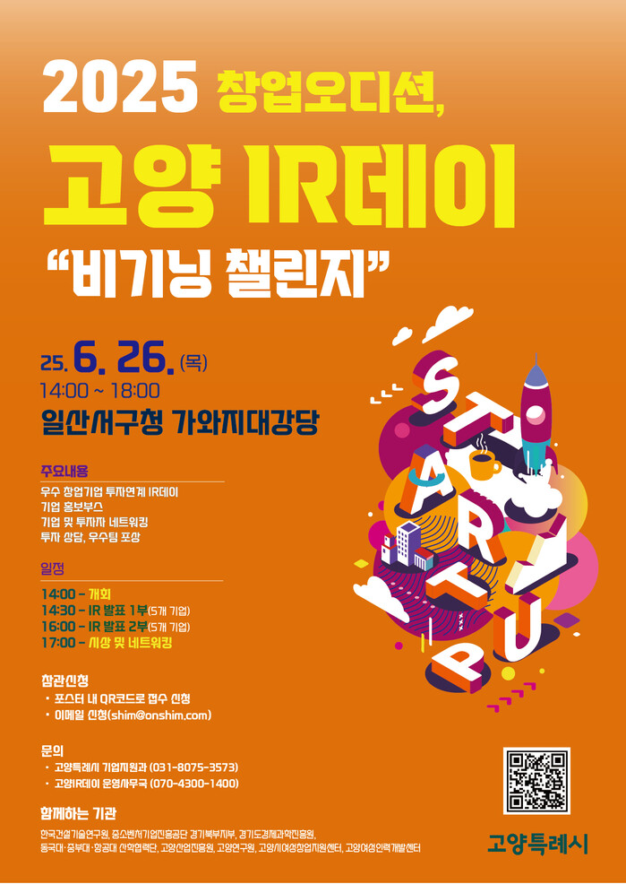 고양특례시(시장 이동환)는 오는 26일 일산서구청 가와지 대강당에서 창업오디션‘2025년 상반기 고양 아이알(IR)데이’를 개최한다고 밝혔다.