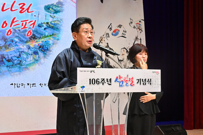 [양평=로컬라이프] 송준형 기자 = 전진선 양평군수는 1일, 제106주년 3·1절을 맞이하여 나라를 위해 헌신하신 애국지사와 순국선열들의 고귀한 뜻을 기리는 기념식을 개최했다.