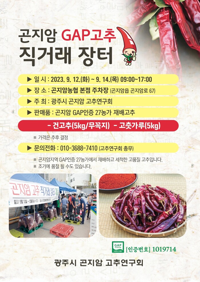 광주시 곤지암 고추연구회는 오는 12일부터 14일까지 3일간 곤지암농협 본점 주차장에서 직접 재배한 건고추와 고춧가루를 판매하는 직거래 장터를 운영한다고 1일 밝혔다.