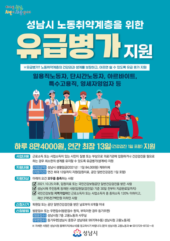 성남시(시장 은수미)는 노동 취약계층의 건강권과 생계보장을 위해 유급병가 지원사업을 편다고 10월 28일 밝혔다.