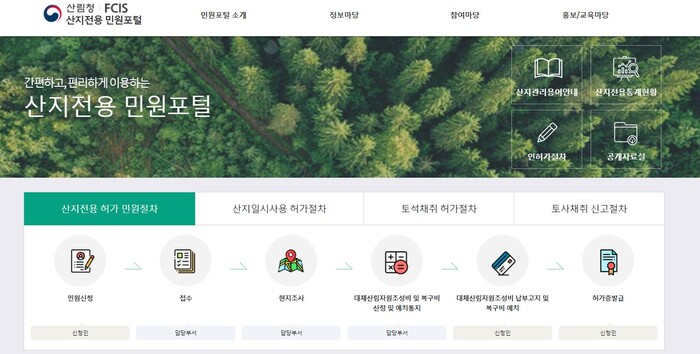 산지전용통합정보시스템에서는 ▲산지 전용 허가(신고) ▲산지 일시 사용 허가(신고) ▲대체산림자원조성비(산지 전용 허가를 받기 위해 내는 세금) 납부 ▲토석(土石)·토사(土沙) 채취 신고 등 민원 서비스를 이용할 수 있고, 민원 처리 내용도 열람할 수 있다.