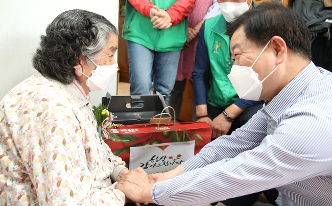 <사진/ 박승원 광명시장은 어버이날을 하루 앞둔 7일 관내 어르신 가정 2곳을 방문해 카네이션을 달아드리며 감사의 마음을 전했다>