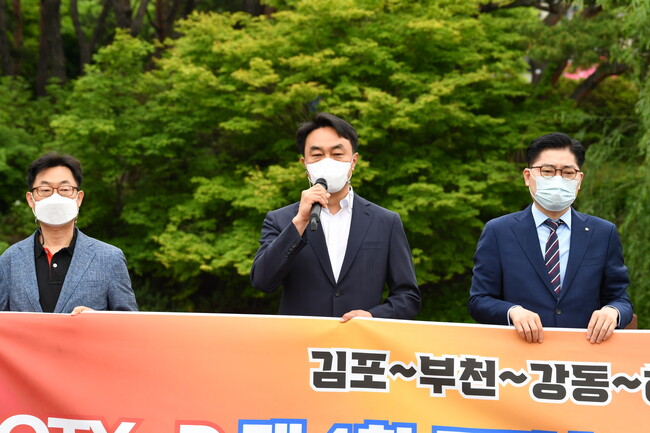 김 시장은 20일 부천종합운동장 1번 출구에서 정하영 김포시장, 장덕천 부천시장, 이정훈 강동구청장 및 지역 시민단체와 「GTX-D 원안노선 반영 촉구 공동입장문」을 발표했다.