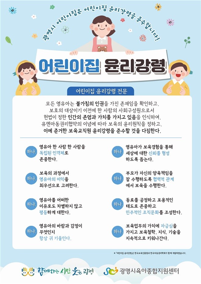 광명시(시장 박승원)는 오는 2월 3일 광명시 육아종합지원센터와 협력하여 관내 어린이집에 ‘어린이집 윤리강령’을 배포한다고 밝혔다.