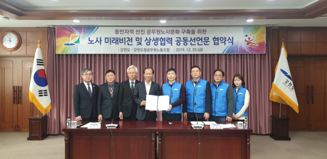 [강원=로컬라이프] 송준형 기자 = 강원도(도지사 최문순)와 강원도청공무원노동조합(위원장 이호범)은 12월 20일 오전 11시 30분 노조간부 및 직원들이 참석한 가운데 「노사간 미래비전 공유 및 상생협력을 위한 공동선언문」협약식을 가졌다.