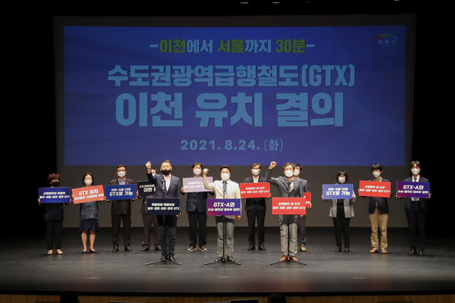 이천시(시장 엄태준)와 이천시의회(의장 정종철) 의원 및 경기도의원(의원 김인영, 의원 성수석, 의원 허원) 의원들이 함께 힘을 모아 GTX 이천 유치 및 GTX-A 접속부 설치를 위한 공동결의문을 8월 24일 발표했다.