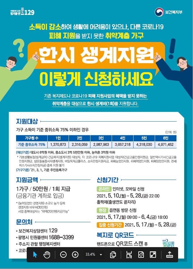 한시 생계지원 대상은 올해 3월 1일 기준 주민등록표에 등재된 가구 가운데 2019~2020년 대비 올해 소득이 감소한 가구 중 가구소득이 기준중위 소득 75% 이하이면서 금융과 부채를 제외한 재산 기준이 중소도시 기준 3억 5천만 원 이하 가구가 해당된다.
