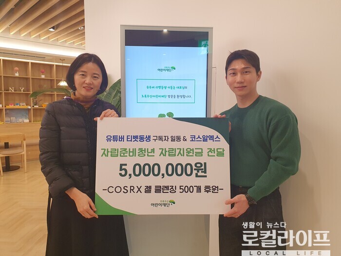 [인천=로컬라이프] 송준형 기자 = 유투버 '티벳동생'이 초록우산어린이재단에 500만 원의 후원금을 전달했다.