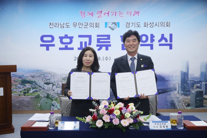 화성시의회(의장 김경희)는 28일, 전라남도 무안군의회(의장 김경현)를 방문하여 상호 우의를 도모하고 지속적인 교류협력을 바탕으로 한 우호교류 협약식을 진행하였다.