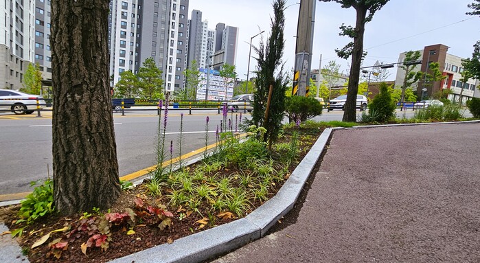 띠녹지는 가로수 사이사이에 사계절 감상이 가능한 수종을 혼합 식재해 작은 정원이 길게 이어지는 모습을 갖췄다.