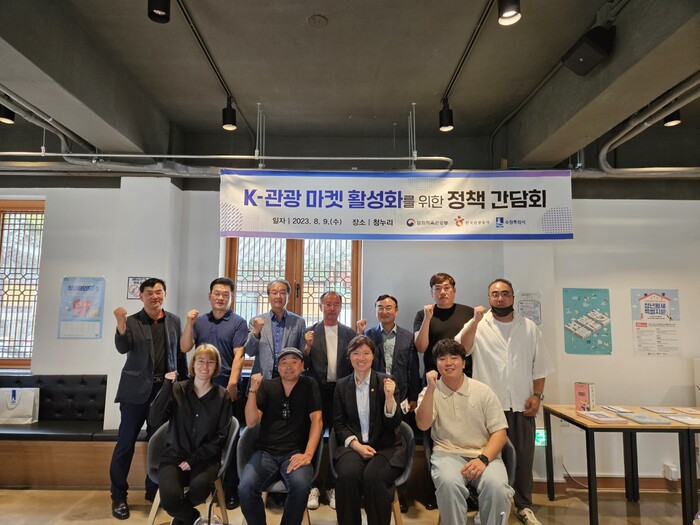 사진/장미란 문체부 제2차관이 K-관광 마켓 활성화를 위한 정책 간담회를 하고 관계자들과 단체사진을 촬영하고 있다.(아랫줄 오른쪽에서 2번째 장미란 제2차관)(사진제공=수원시)