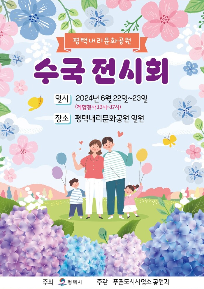 평택시(시장 정장선)는 수국 개화 시기에 맞춰 내리문화공원(평택시 팽성읍 내리 260)에서 오는 22일(토)부터 23일(일)까지 ‘내리문화공원 수국 전시회’ 행사를 진행한다고 한다.